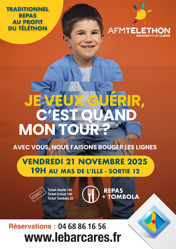 A cette occasion, Barc’Anime sera le l’association organisatrice du repas du Téléthon, le vendredi 21 novembre, à partir de 19h au Mas de l’Ille.